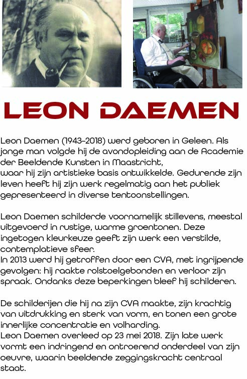 Expositie's in De Galerie Leon Daemen (1943–2018) werd geboren in Geleen. Exposeert in onze wissel expositie ruimte.Van 2 Januari’26 t/m 14 februari ’26 Facebook-f Instagram